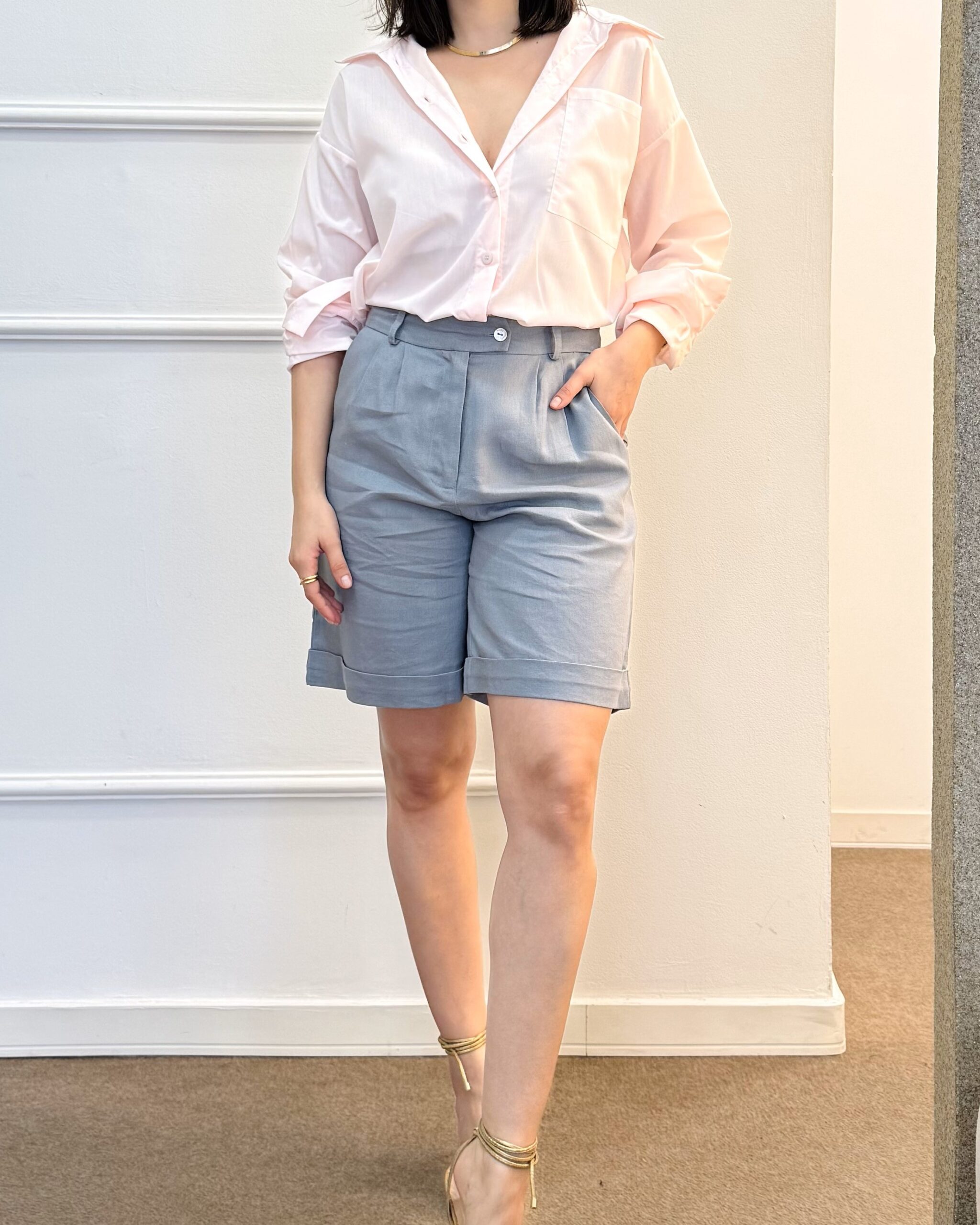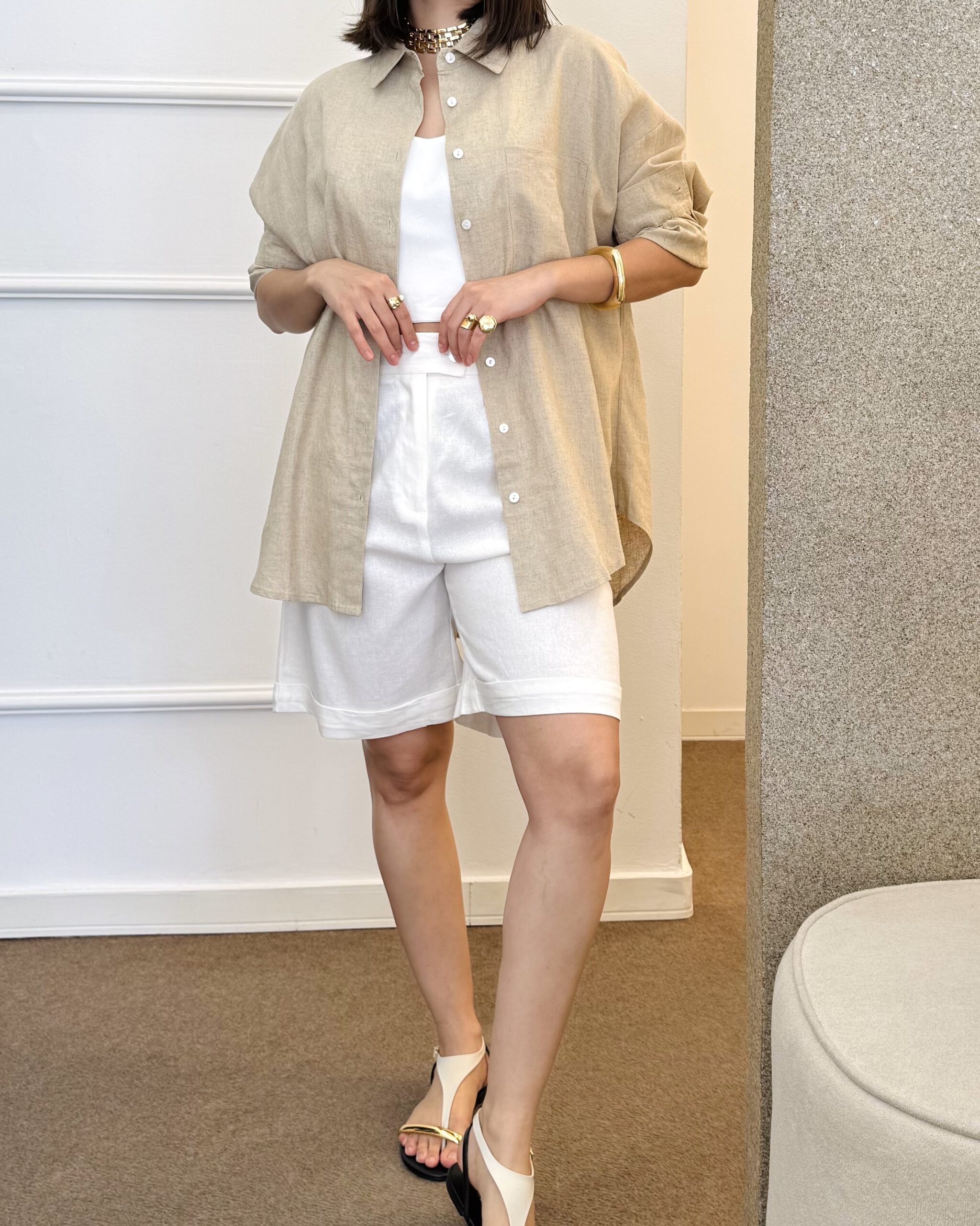 Bermuda em linho misto com modelagem ampla no comprimento, bolsos frontais e traseiros, e barra dobrada. Possui cós com passantes, botão lateral e zíper.