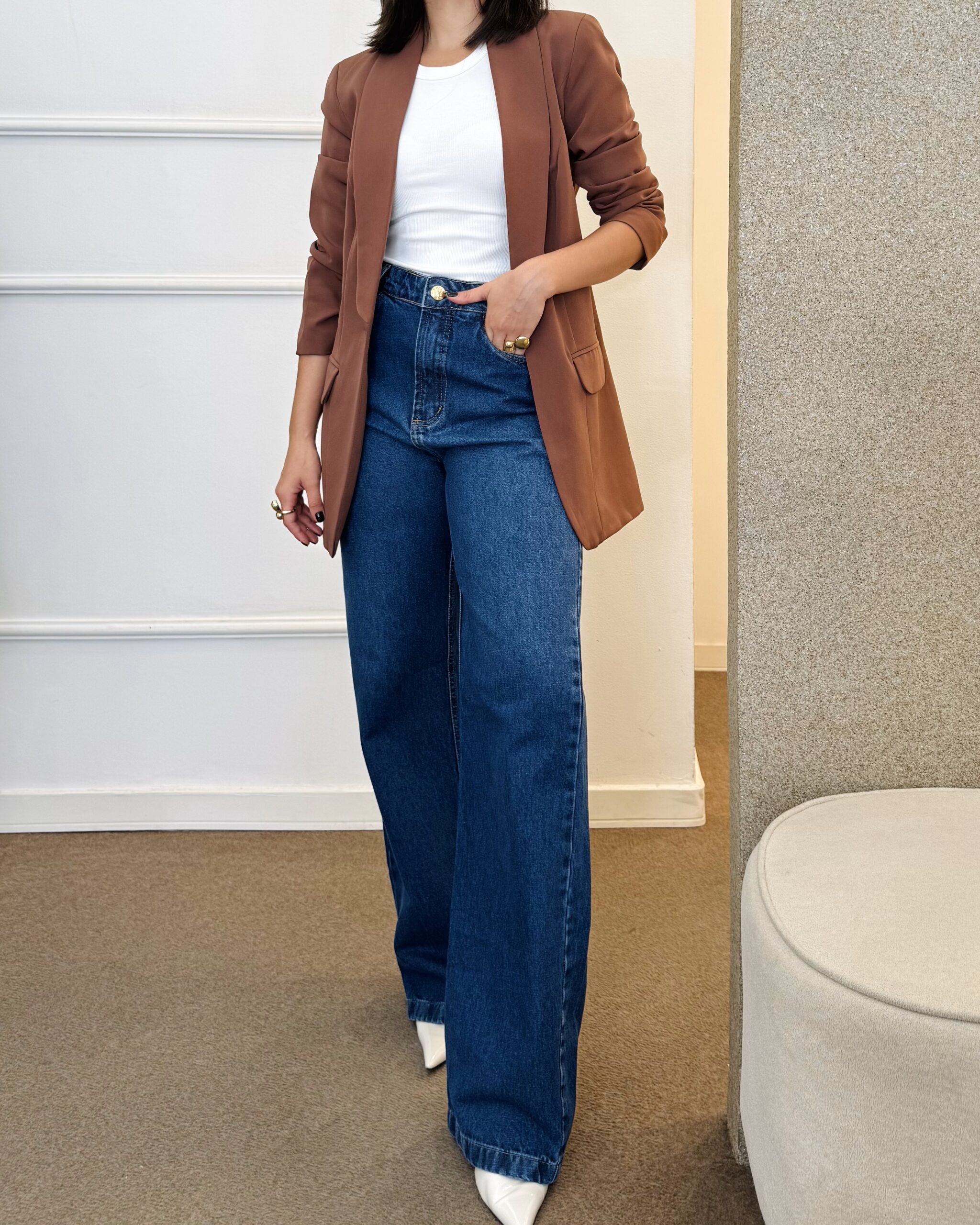 Blazer com modelagem slim alongada, forrado, com ombreiras e botão frontal dourado.