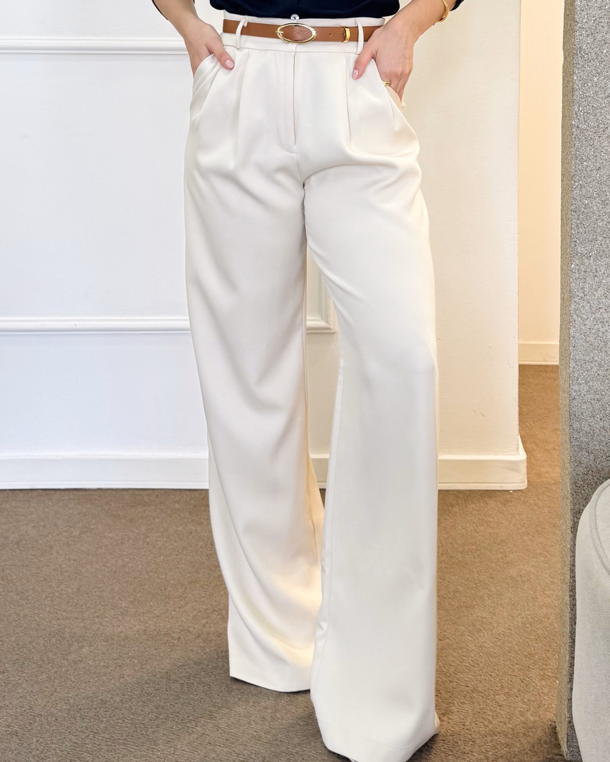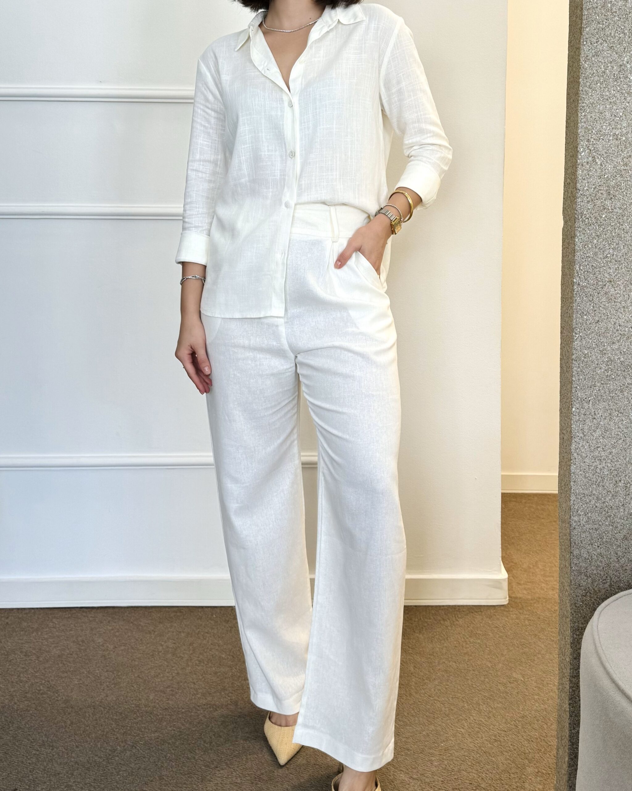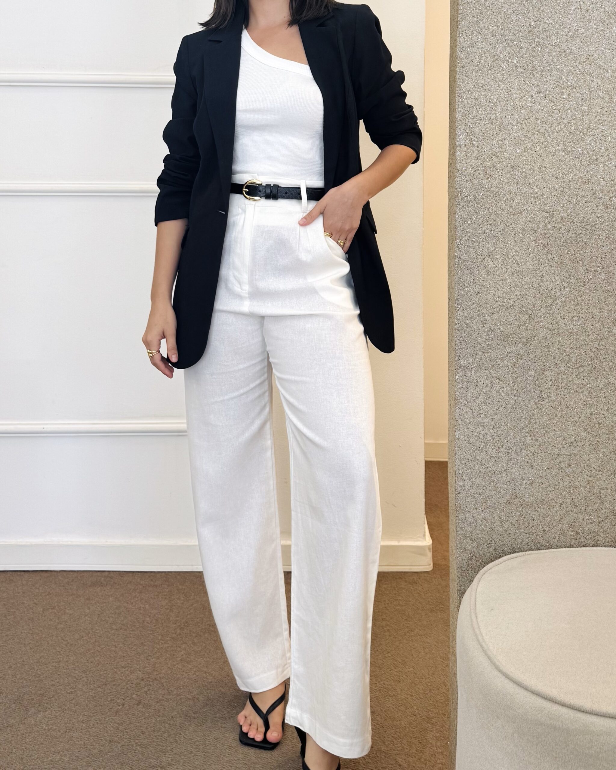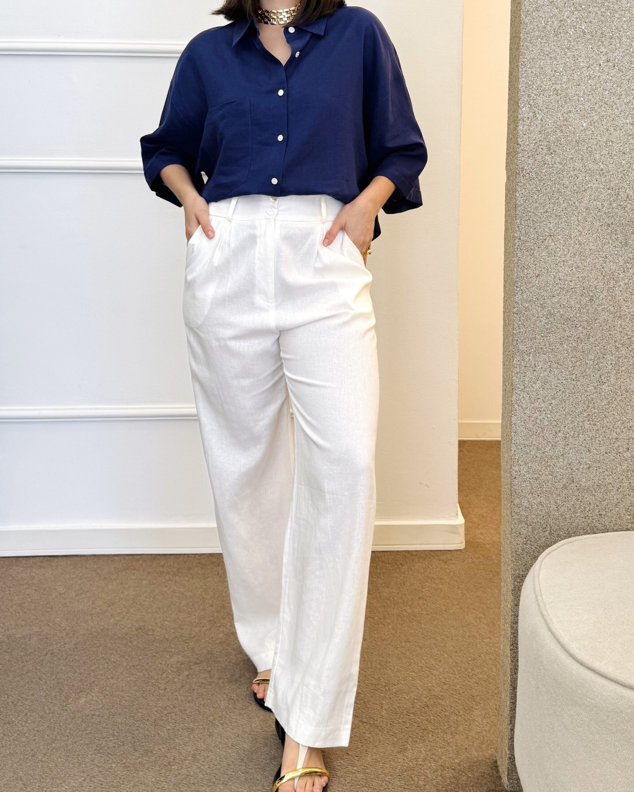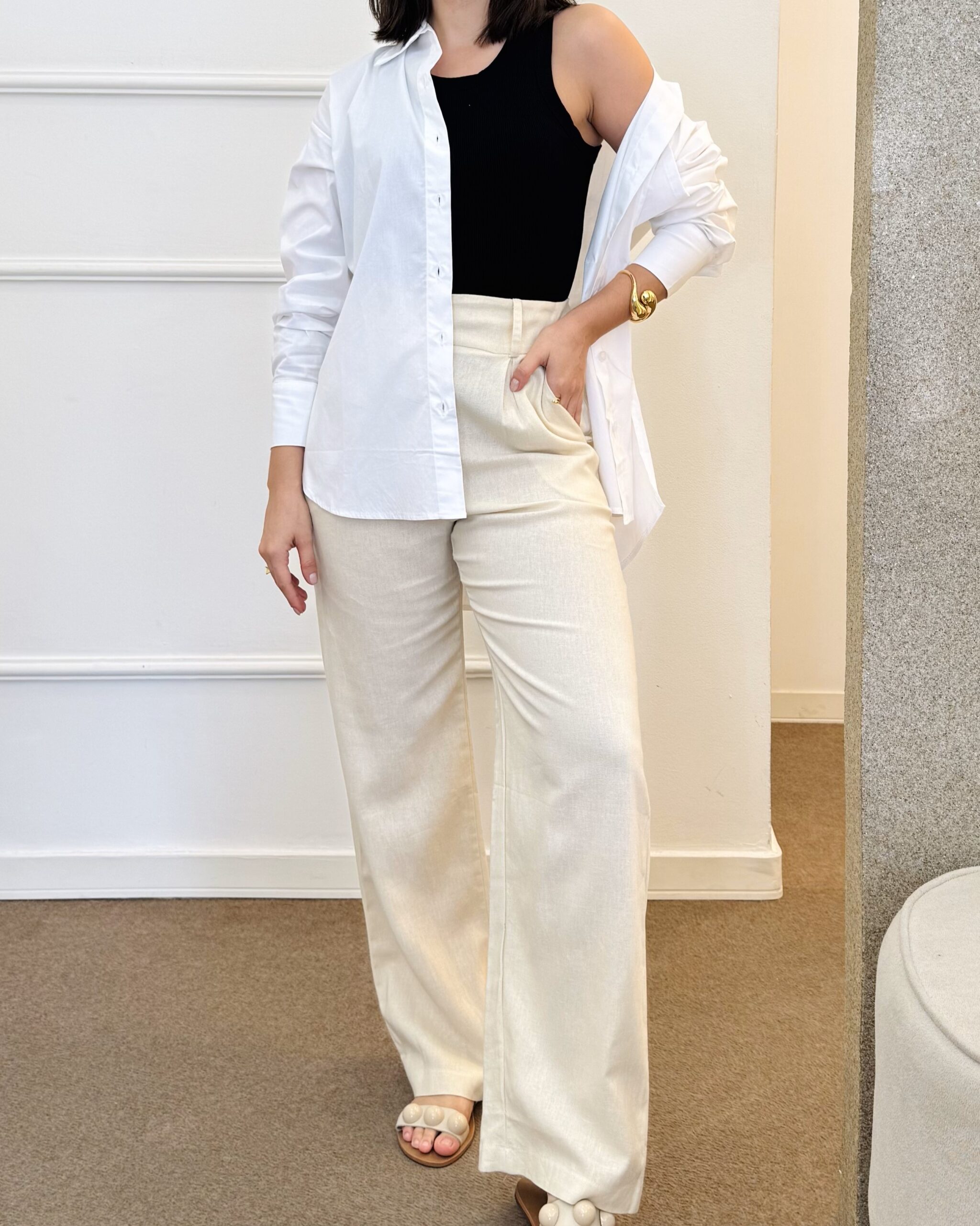 Calça cintura alta em linho misto com modelagem reta e cós com botões duplos, passantes e zíper