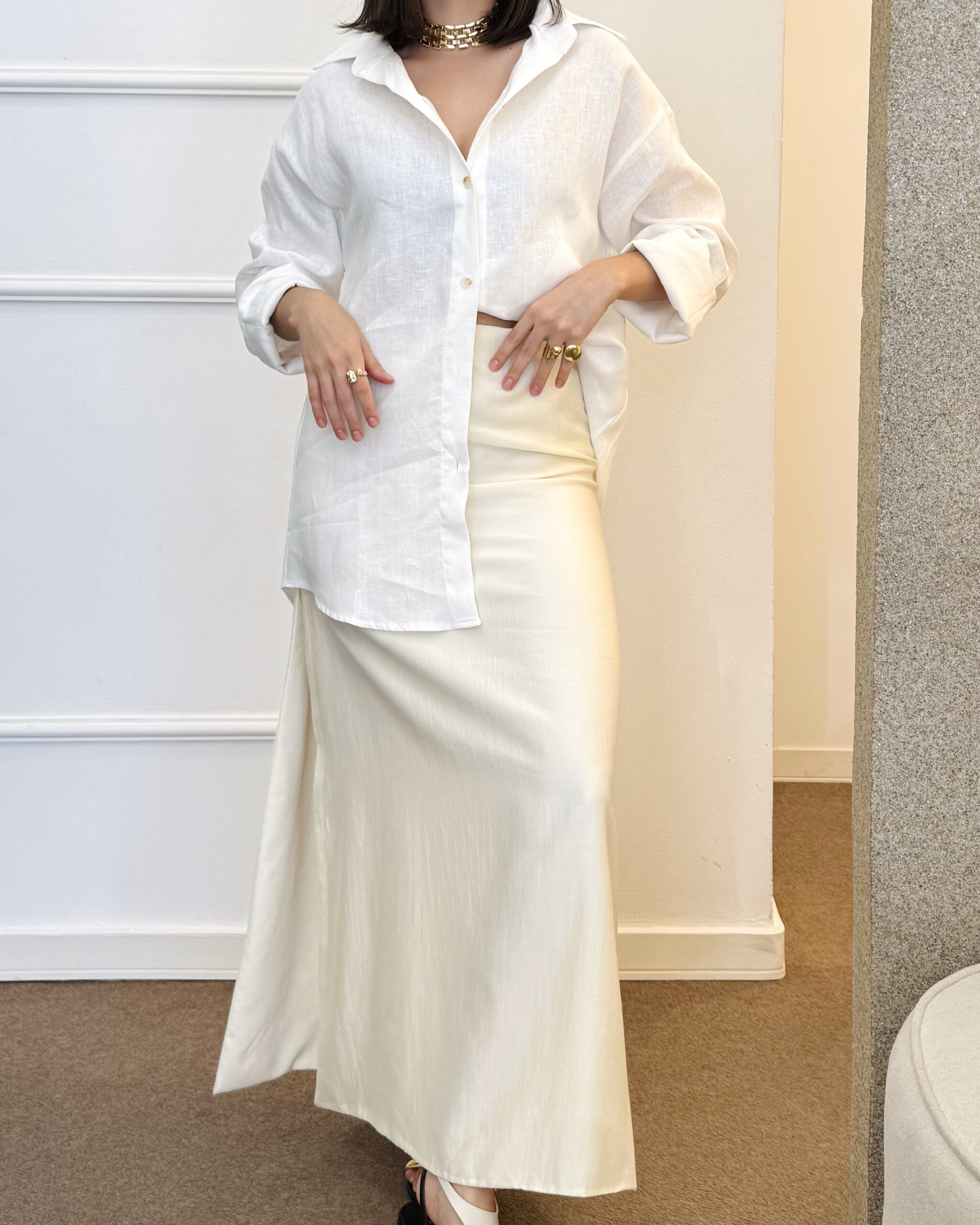 Camisa em linho puro com modelagem ampla e botões frontais.