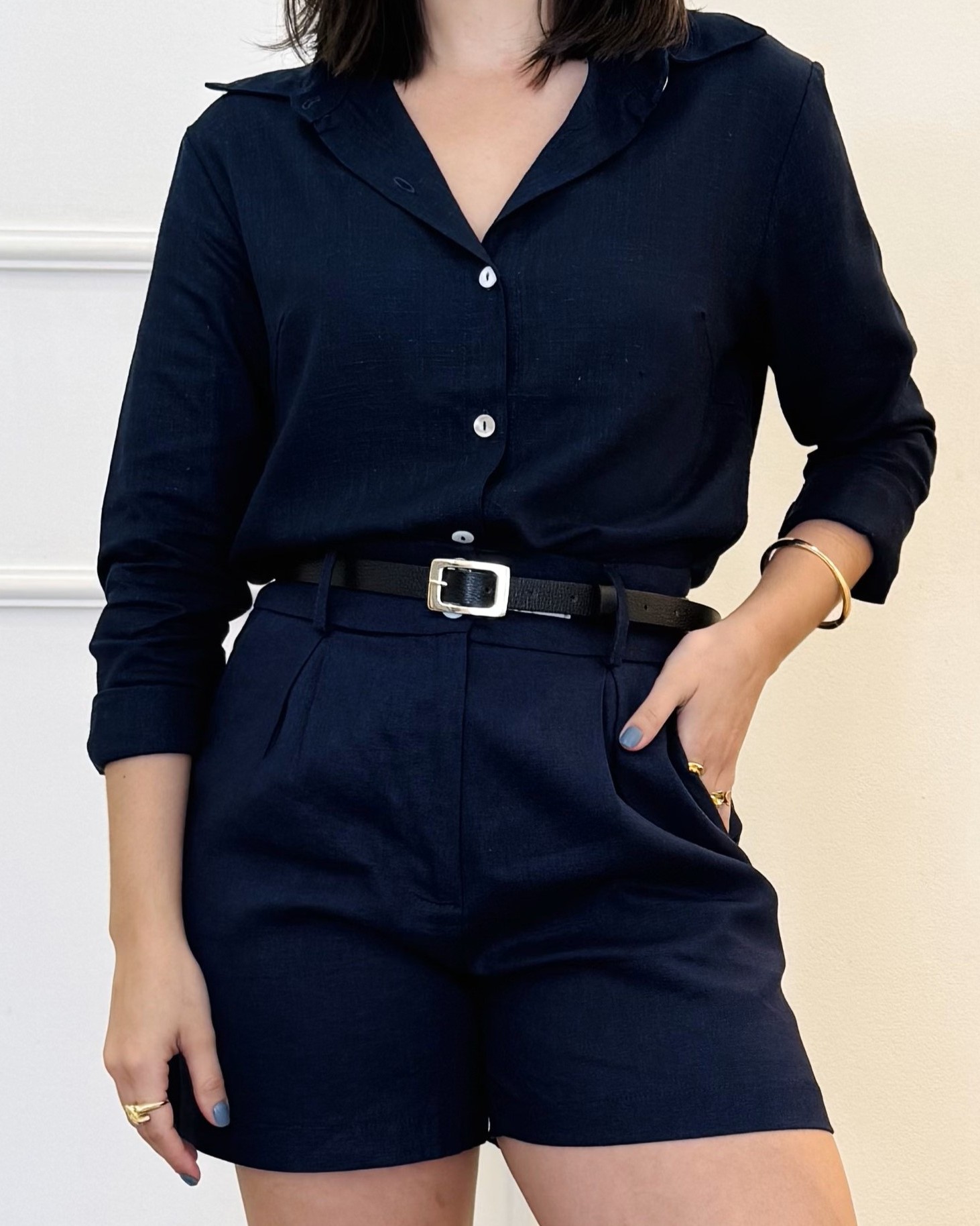 Short em linho misto com modelagem solta e bolsos (frontais e traseiros), possui cós com botão duplo em madrepérola e zíper.